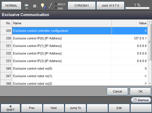 | 330 | 排他控制IP(0)[IP Address] | - | 127.0.0.1 | 设定主局机器人的IP地址。 将主局机器人放进排他组时,请直接使用初始值。从排他组剔除时,请输入[0.0.0.0]。 |