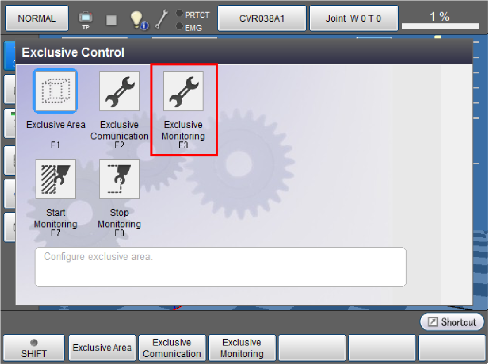 操作路径:基本画面 - [F2 机械臂] - [F6 辅助功能] - [F11 排他控制] - [F3 排他监视设定]