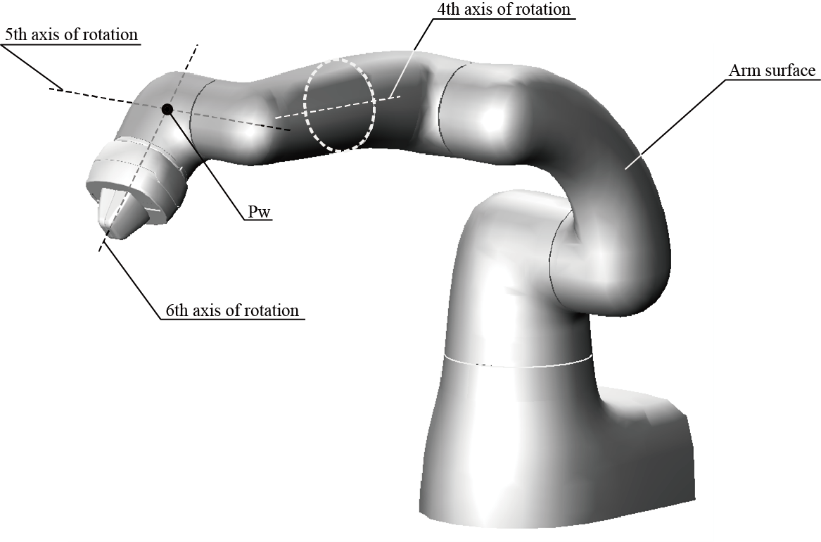 使用第5轴的旋转轴和第6轴的旋转轴交叉点“Pw”的位置进行臂、肘、手腕的边界的判断。