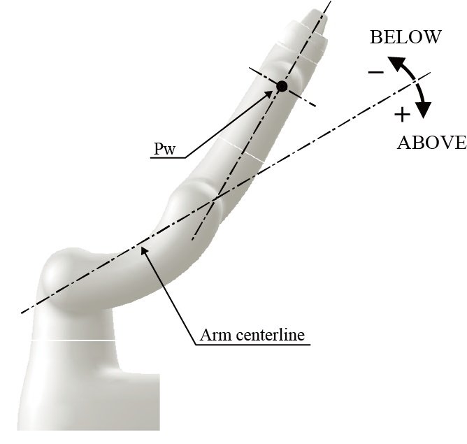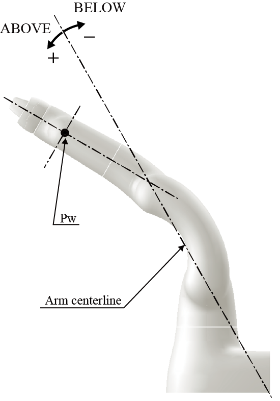 对于臂中心线,在“Pw”的位置位于+侧时是蜷起形态可移动的范围,位于-侧时是伸直形态可移动的范围。