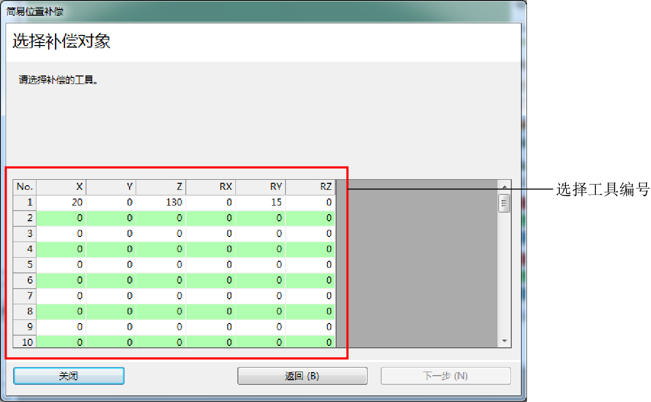在显示“在实施补偿之前,为当前的值建立备份。”时,按[OK],所选择的当前工具坐标数据将被备份。