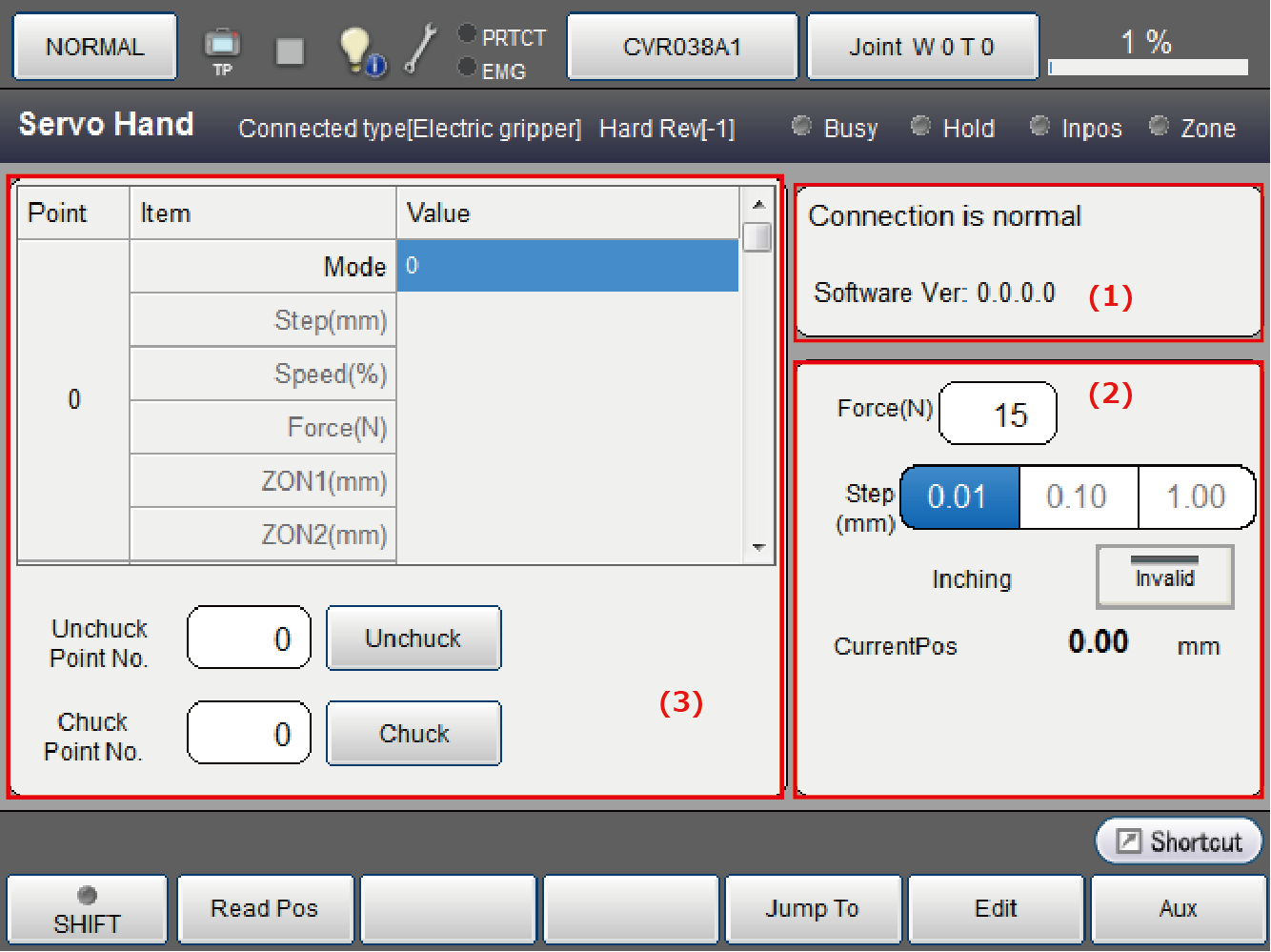 夹治具画面由(1)夹治具状态显示、(2)手动动作、(3)测点数据显示,这3部分构成。