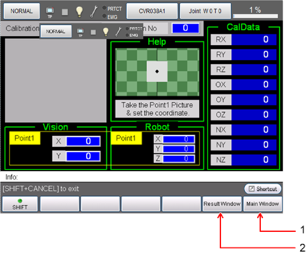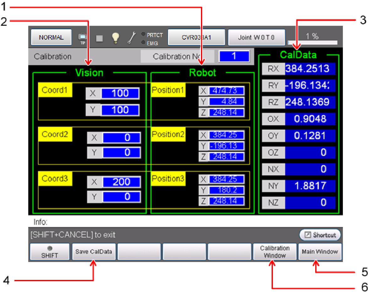 可确认和保存校准计算中使用的标记的视觉坐标和机器人坐标及由此计算出的结果的CalData。如果更改Calibration No(0~31),则可确认各自的计算结果。