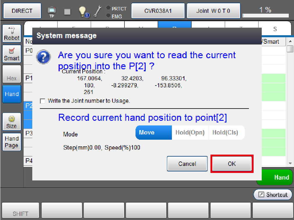 完成夹治具动作指定之后,可以按下COBOTTA的机械臂上的功能键,或者按下变量画面的[F6 位置获取]按钮。