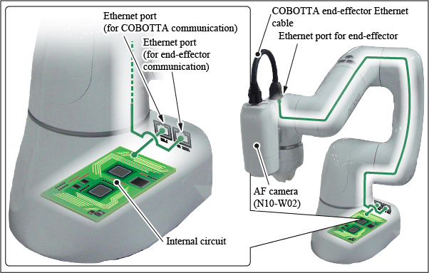 为控制AF照相机(N10-W02),可通过Ethernet电缆将AF照相机(N10-W02)与COBOTTA内部回路进行连接。Ethernet端子(前端通信用)通过COBOTTA内部配线连接到前端Etnernet端子,但不连接到内部回路。