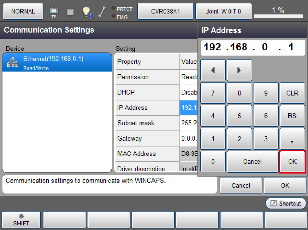 显示数字键后输入希望设定的IP地址并按压[OK]按钮。则COBOTTA的IP地址会变更。