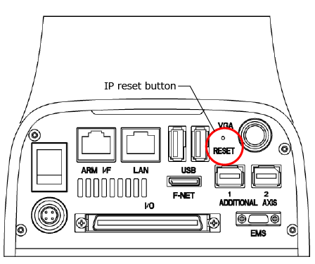 长按下图所示COBOTTA的IP复位键2秒以上后,将对COBOTTA的IP地址设定(COBOTTA本身的IP地址和AF照相机(N10-W02)的连接设定IP地址)进行复位。复位后数值见下表。