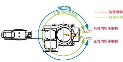 所有轴的动作范围的正方向侧和负方向侧,均设定有软件限制。正方向侧的软件限制称为正方向软件限制,负方向侧的软件限制称为负方向软件限制。