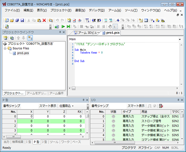 WINCAPSIIITP应用的辅助性软件。虽然编程语言与TP应用相同,但是机器人程序易编程,可管理多台COBOTTA数据。该工具也可以在其他电装机器人上使用。 可安装的OS为Windows。此外,WINCAPSIII是假定在PC上使用的产品。 可以使用Ethernet与COBOTTA进行通信。 |