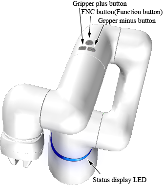 变为直接模式后,状态显示LED蓝色灯亮起。但是,如果让COBOTTA运转到可动区域界限附近,状态显示LED的黄色灯就会亮起。另外,发生错误时,黄色或红色灯亮起。
