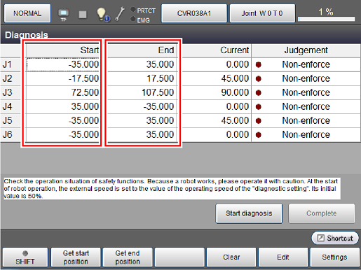 执行“DiagnosisMove”后,COBOTTA动作时各轴动作角度会超出诊断动作角度。具体目标位置可通过TP应用确认。