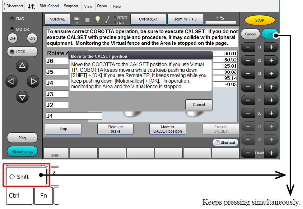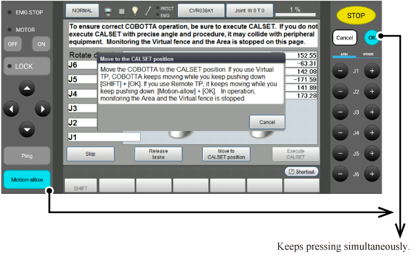 如果COBOTTA抵接到CALSET位置就会显示动作完成的讯息视窗,在此之前请一直按住按钮。