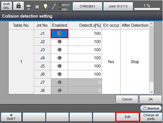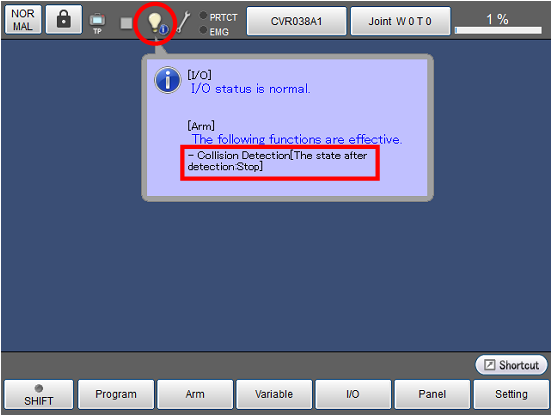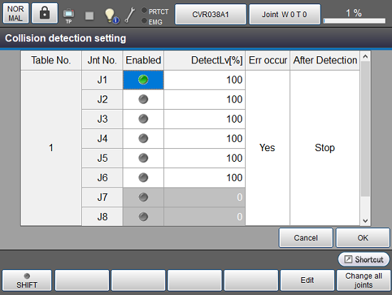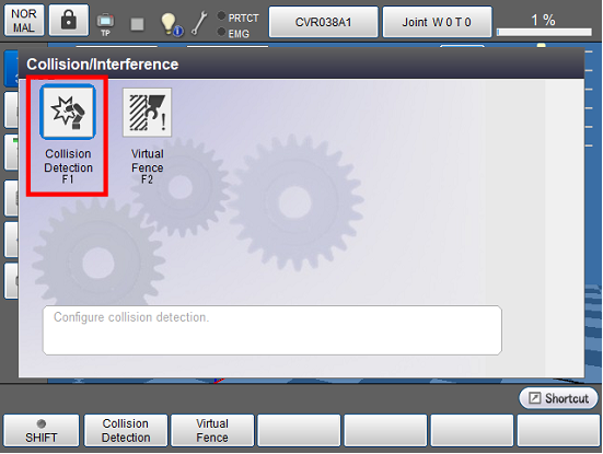 操作路径:基本画面 - [F2 机械臂] - [F6 辅助功能] - [F2 碰撞/干涉] - [F1 碰撞检测]
