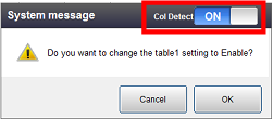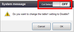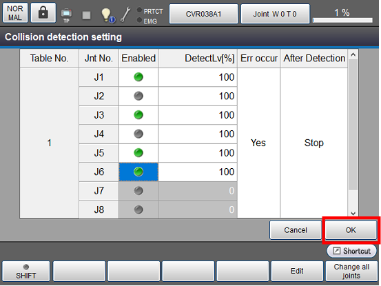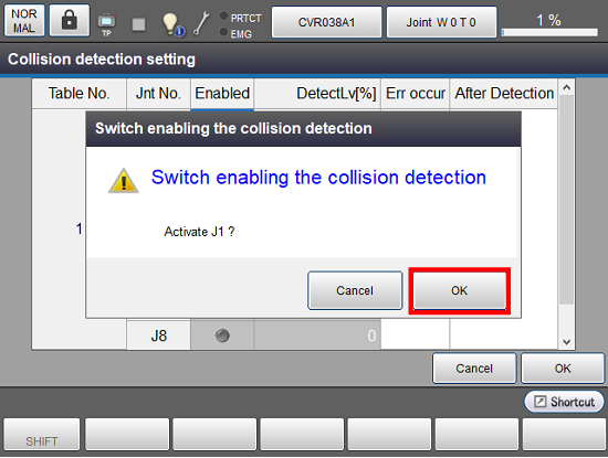 显示系统消息后将所有轴设为有效时,将碰撞检测设为[ON];无效时设为[OFF]后按压[OK]。