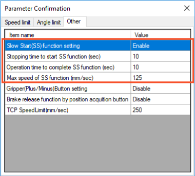 | SS开始之前的停止时间(秒) | 10 | 慢启动功能有效时,机器人停止时间超过设定时,机器人将以低速动作。 但是以下情况下无论设定时间如何,慢启动功能均有效。