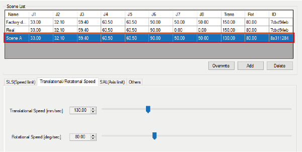 这时,将场景A的安全参数追加到Scene列表中。(将并进速度设定成130.00mm/sec,以“场景A”的名称追加。)