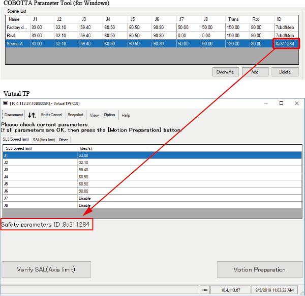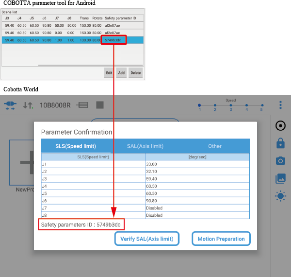 比较COBOTTA参数工具的Scene列表安全参数ID和在TP应用或Cobotta World中显示的安全参数ID。
