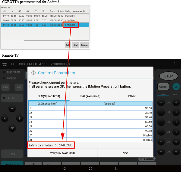在Windows用的COBOTTA参数工具和COBOTTA参数工具 for Android中,即使安全参数的内容全部为同一值,安全参数ID也有可能不同。确认安全参数ID时,请确认实际发送到COBOTTA的COBOTTA参数工具的安全参数ID。