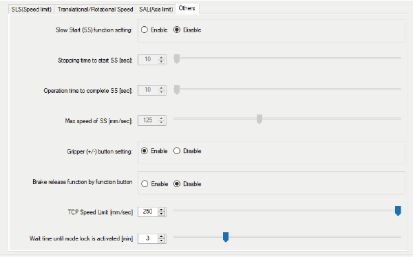 | 臂前端限制速度 | 250 [mm/sec] | 设定臂前端限制速度的设定(手动动作时的合成最大速度)。 |