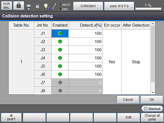 设定检测到碰撞时是否发生错误。 按下[编辑]按钮,显示设定切换的窗口。 选择是/否,按下[OK],即设定值。 有关详细内容,请参照功能指南碰撞检测功能中的“碰撞检测时有无发生错误的设定”。 |