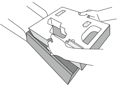 取出缓冲材料(苯乙烯)上方的虚设连接器(I/O)な等细小包装品并缓慢向上拉起缓冲材料后取出。