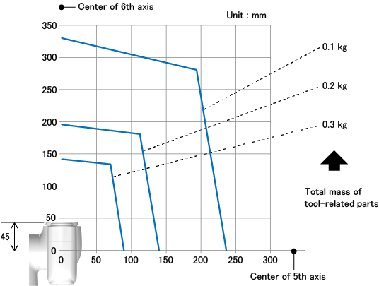 下图按工具相关部分的总质量表示从6轴旋转中心和5轴旋转中心的交点到工具相关部分的重心位置为止的距离允许范围。