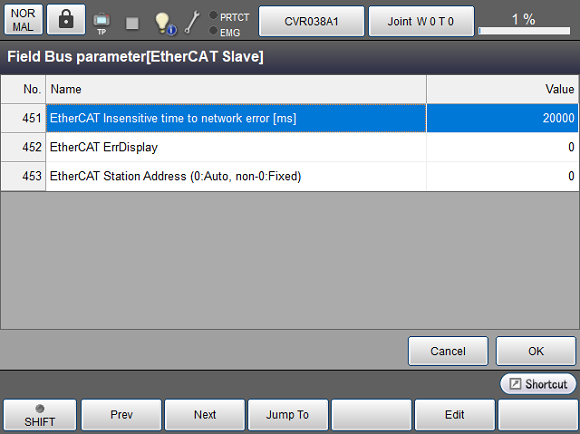 启动COBOTTA,如果到开始EtherCAT通信的通信状态检测的时间较短,则启动后立即发生[8350200B:正在进行现场网络通信准备]。在该情况下,延长并调整异常检测等待时间(ms)。