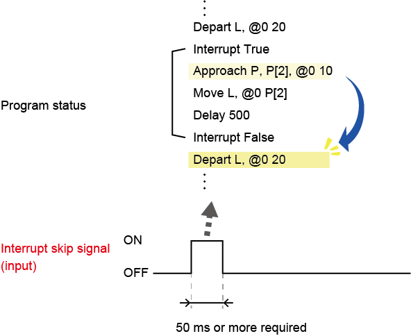 在被程序的“Interrupt有效”和“Interrupt无效”所括起来的范围内,在执行机器人动作指令的过程中,如果将该信号置于ON,则瞬时停止该步骤的动作,开始执行下一个步骤。