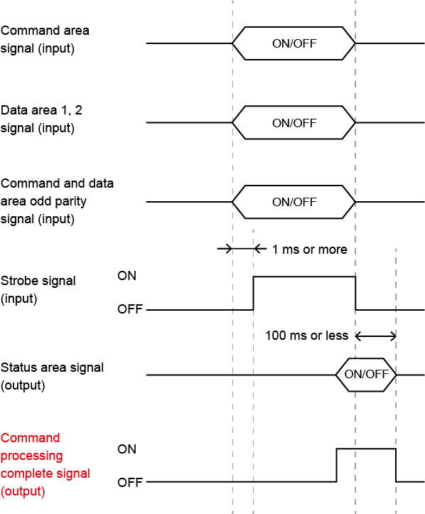 指令处理完毕之前,选通信号OFF时,指令处理完毕信号一旦输出后,将在100ms内变为OFF状态。