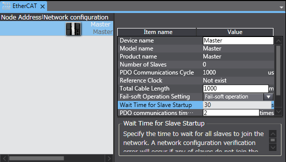 在OMRON EtherCAT Master的设定项目上,有[全部子局加入等待时间]。初始值为30[sec],因此请设为45[sec]以上。根据连接的EtherCAT Slave机器,需要设为更长的时间。请根据顾客的使用环境进行设定。