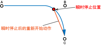 在通过动作的减速中执行瞬时停止,之后再重新动作时,将按照下一个步骤的指令值动作。速度和加速度、减速度较低时,请加以注意。
