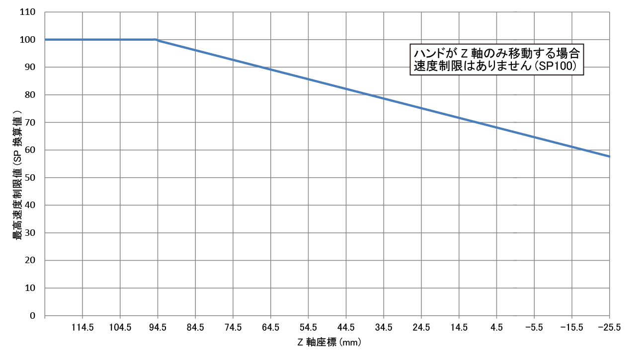 - Z軸下降端付近での位置決めをより安定させるためにロボットがPTP動作で移動する場合に限り、J1軸とJ2軸のみ下図に示すように自動的にZ軸座標位置により最高速度制限をしています。従って、J1軸、J2軸の位置決め時間は下図の最高速度制限値によって長くなります。