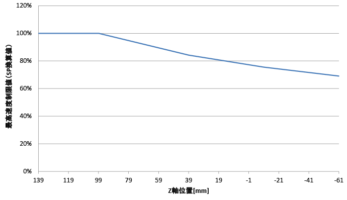 動作終了位置のZ軸座標 0mmの場合、SP100で運転するときの最高速度制限値はZ軸座標 70mmのとき91