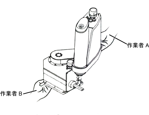 固定用ボルトを外すときは、ロボットが転倒しないように作業者の1人が第1軸アームを支えてください。