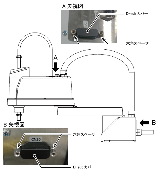 CN21コネクタとCN20コネクタには下図のようにD-subカバーが付いています。CN21コネクタとCN20コネクタを使用する際には、D-subカバーを取り外して使用してください。