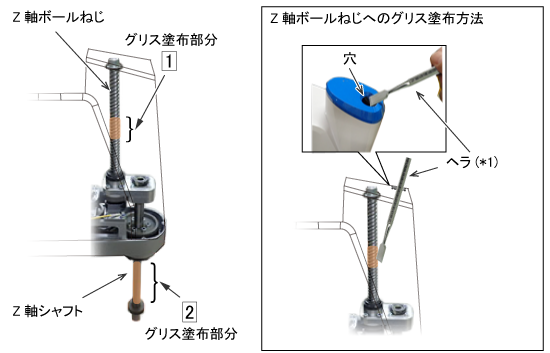| 1 | Z軸ボールねじ | 410971-0380 | 3g | Z軸シャフトを一番下に下げた状態で、カバーの上部の穴からヘラ(*1)を使用し、Z軸ボールねじの中心近辺に塗布する。 |
