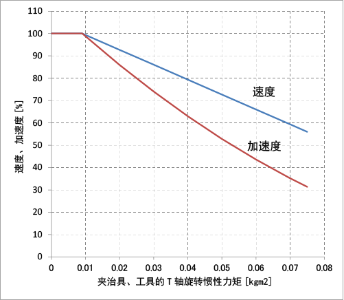 关于相对夹治具、工具的T轴旋转惯性力矩的值的速度和加速度的限制值,请通过下图的图标求出。