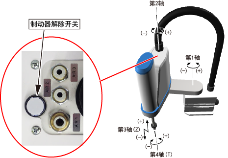| 第3轴(Z轴) | 解除电机的制动器,用手移动轴。 制动器解除有以下的方法。