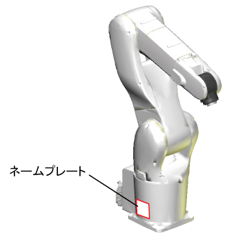 ロボット本体のネームプレートはベース部に貼ってあります。ネームプレートにはロボット固有のシリアルNo.やロボット型式、製造日などの情報が記載されています。