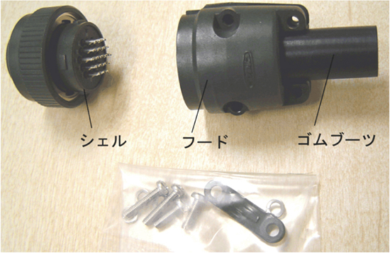 ゴムブーツをシェルに押し当てフードを組付けます。ゴムブーツの上に熱収縮チューブをかぶせ、熱収縮させます。
