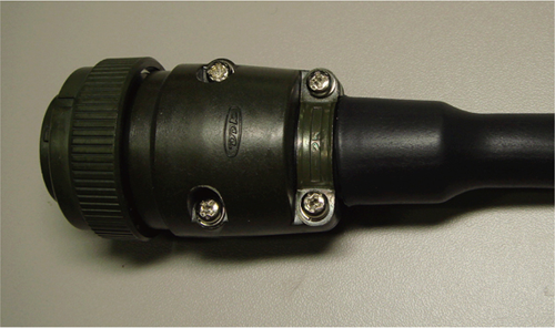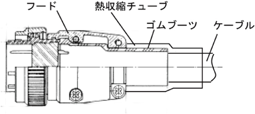 ケーブルに防滴用の熱収縮チューブ(接着剤付、お客様手配)とゴムブーツを通します。