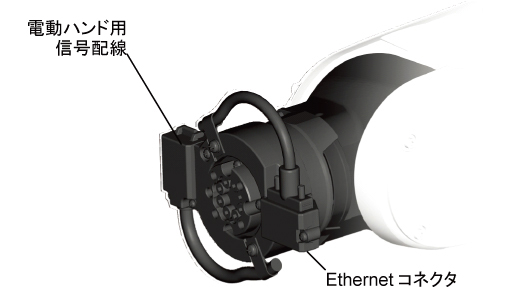 フランジ部に信号配線及びEthernet(1000BASE-T)のコネクタが装備されます。ロボットベース側のコネクタパネルにはそれらに接続されているCN24のコネクタとEthernetコネクタが装備されます。