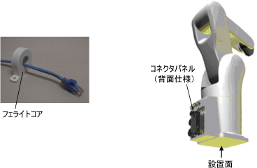 Ethernetケーブルを接続するときは、コネクタパネルにできるだけ近い位置にフェライトコアを取付け、付属の結束バンドで固定してください。コネクタパネル底面仕様では、設置面にコネクタパネルが配置されています。