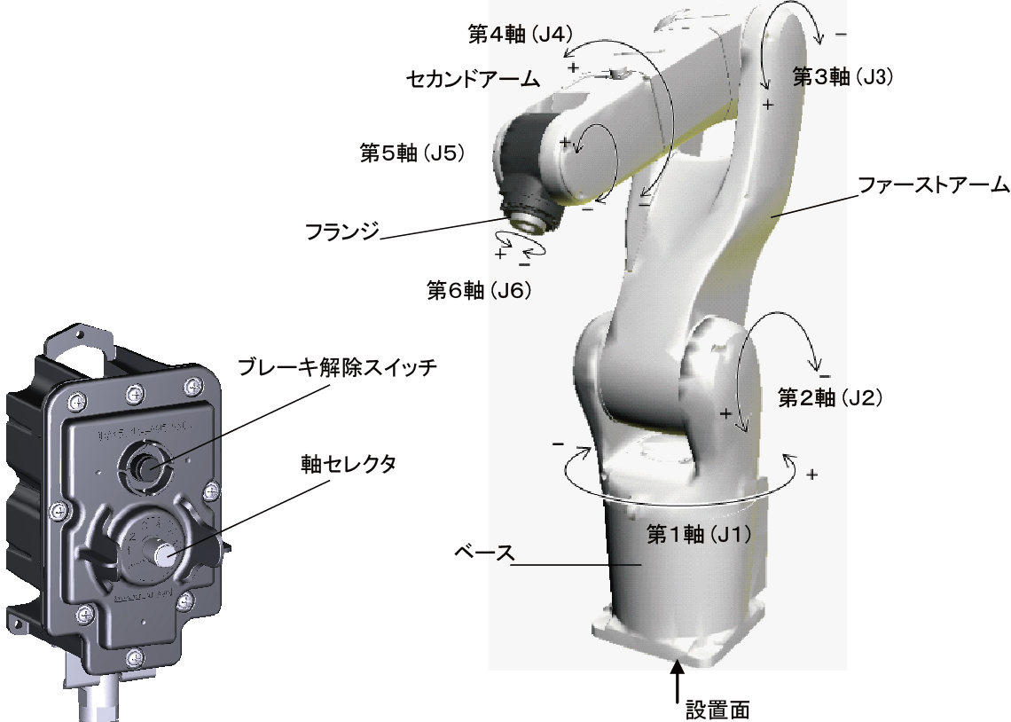 操作方法は、ティーチングペンダント操作ガイド「アーム保守機能の表示・設定」またはミニペンダント操作ガイド「ブレーキ解除とロック」を参照してください。