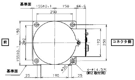 - 設置台のロボット固定位置に下図に示す寸法に従って、4ヵ所にボルト穴(M12)を深さ15mm以上開けます。