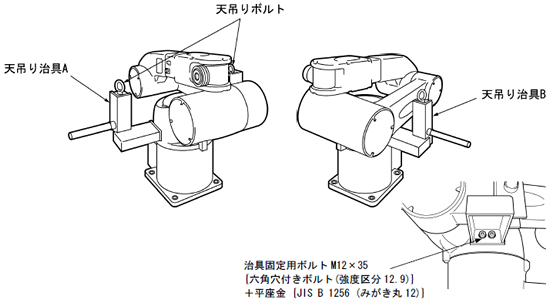 ロボットを天吊り設置する場合には、天吊り治具A、B、Cとホルダー(2個)、回り止めプレート(2個)の5種類の治具が必要です。参考図面を示しますので、必要に応じて、お客様にて製作してください。