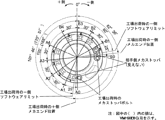 A0 <工場出荷時メカエンド位置> VM-6083:+167°46′ VM-60B1G:+170°37′ <工場出荷時ソフトウェアリミット> VM-6083:+165° VM-60B1:+168° |