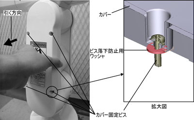 カバー取り外し時の注意です。 ビス落下防止用ワッシャが内部で外れないように写真のように引きながら、4点のカバー固定ビスを均等に緩めてください。