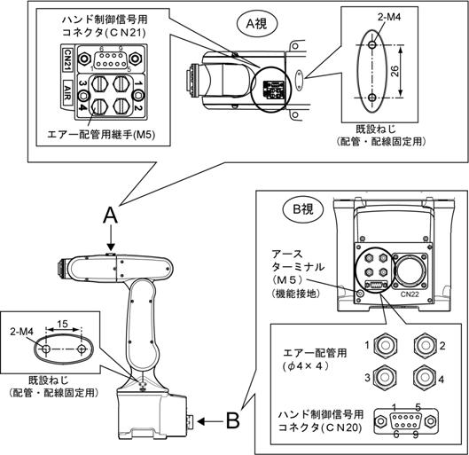 エアチャック用エア配管4本(φ4)および信号用配線9本を本体内に備えています。