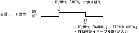 外部からプログラムの起動を行なうためには、「モード切り替えコマンドによる外部モード切り替え」・「プログラム操作コマンドによるプログラム起動」の入力が必要です。このとき、自動モード出力信号を監視して、コマンド実行の可否判定に使用します。